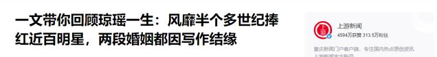 信息来源:上游新闻——一文带你回顾琼瑶一生:风靡半个多世纪捧红近百明星,两段婚姻都因写作结缘,2024年12月4日