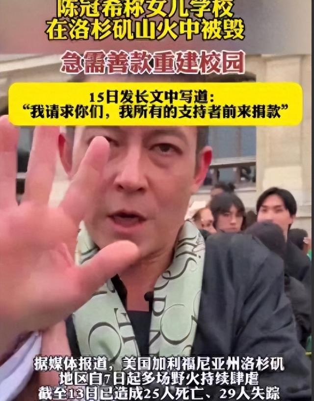 信息来源:观察者网,2025年1月16日,洛杉矶山火持续肆虐,港星陈冠希发文求助:女儿学校被毁,急需善款