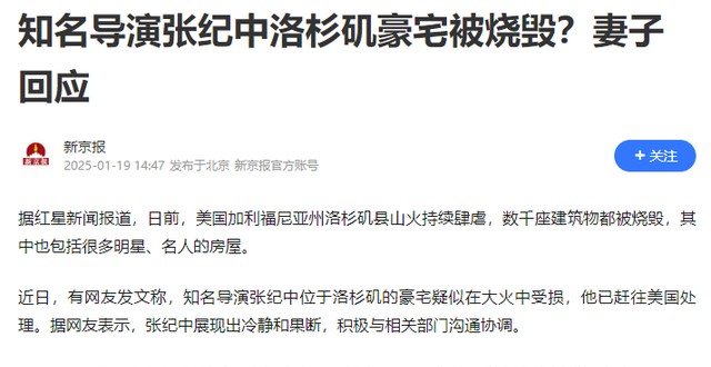 新京报,2025年1月19日,知名导演张纪中洛杉矶豪宅被烧毁?妻子回应