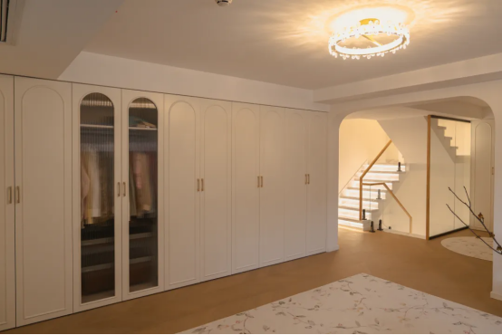 衣帽间大面积的暖白柔光+经典弧形造型,让人一眼陷入法式的优雅之中,一门到底的圆弧形长虹玻璃是空间的点睛之笔。