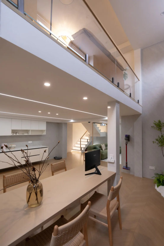玄关和楼梯也是整个空间的一大亮点,原木+白的整体基调,让空间充满暖意和慵懒,呈现高调的生活美学氛围,关上门,一切喧嚣和负累似乎都可以在瞬间得到清除与净化。