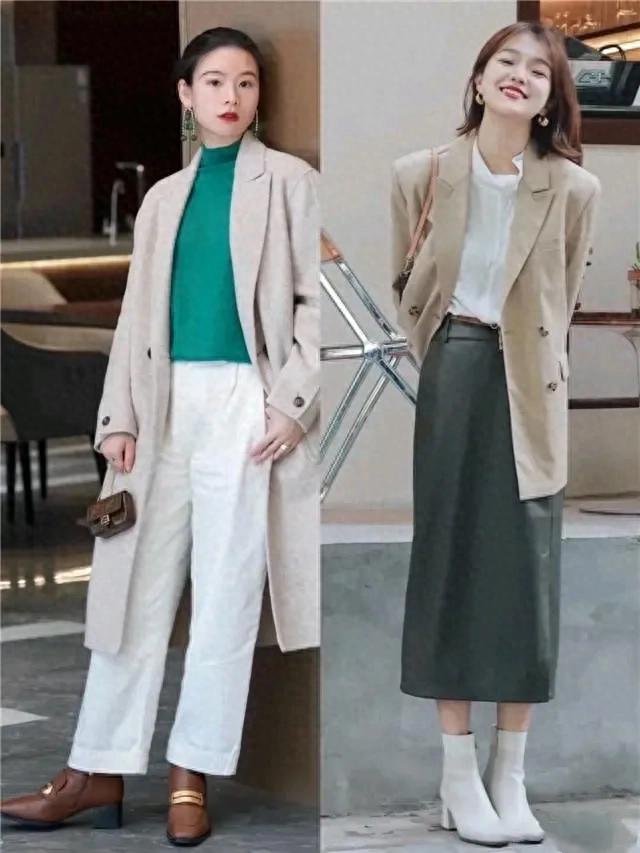 例如下面左边的这位博主选择的是一件西装领的大衣外套,内搭绿色的毛衣,下半身是选择一条白色的直筒九分裤,脚踩粗跟的短靴,这样的穿衣造型简约干练。