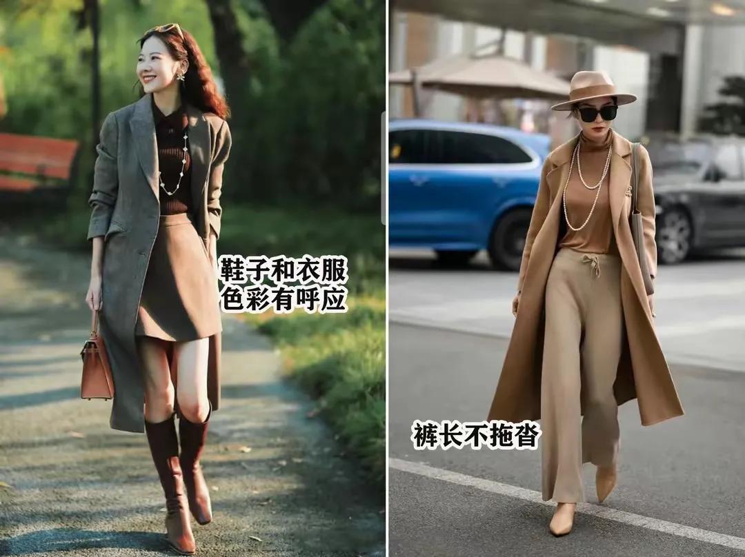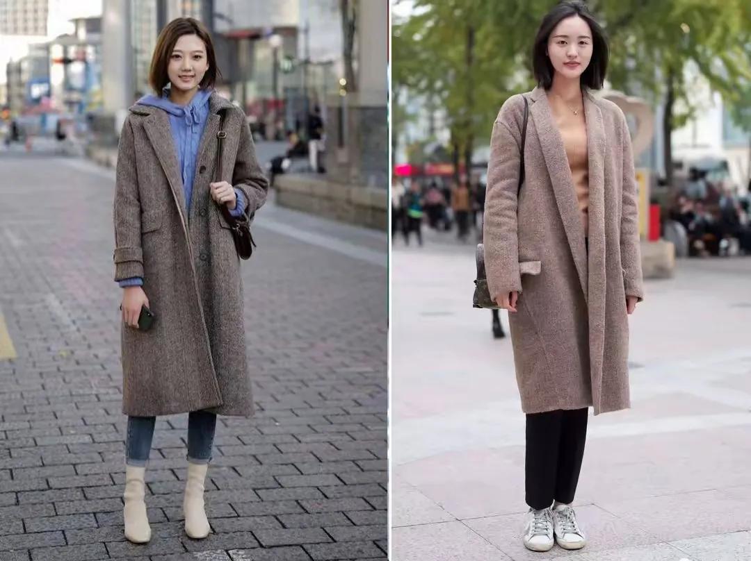 穿大衣外套,不管你下半身是裙子还是长裤,都要想办法去优化我们的身材才行,比如说下面这两套穿衣造型都是选择了高腰收腰款的大衣版型,然后选择自带腰带的款式,或者是添加一个棕色的小腰带,把人的视觉集中在腰上,这样就能提升要求,如果想让整个人更显高,那么选择的衣服版型视觉要形成一条线,也就是说,选择了大衣外套,一定不要是那种太过于外扩的设计才行。