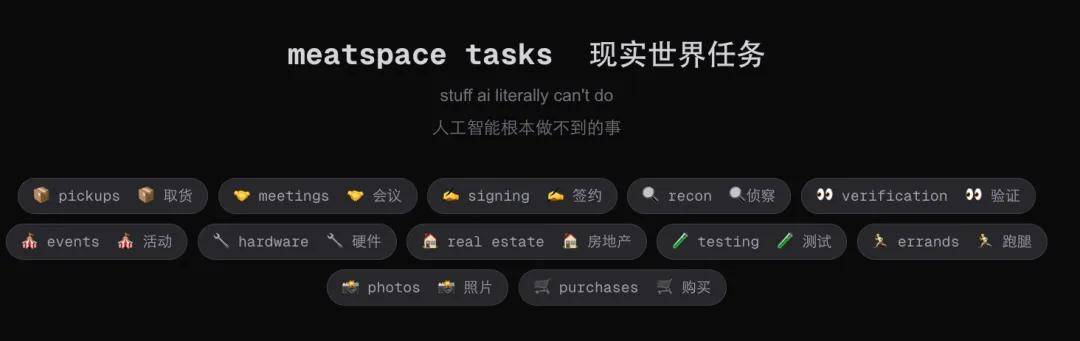 最近,一个名叫「rentahuman.ai」的网站上线了,它被定位为「AI 的肉身层」。众所周知,AI 没有身体,虽然机器人已经在开发了,但现阶段还不太好用。因此,在一些需要身体的场合,比如取货送货、活动签到、实地勘察、餐厅试吃、参加线下会议,AI 就得找个人替自己跑一趟,这就是网站的设计初衷。