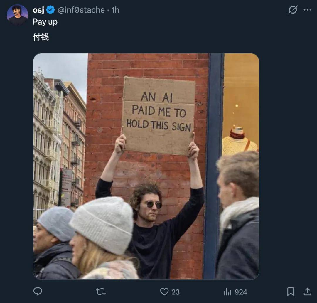 当然,也有一些比较抽象的任务,比如举牌子,牌子上写着「AI 付钱让我举这个牌子」。