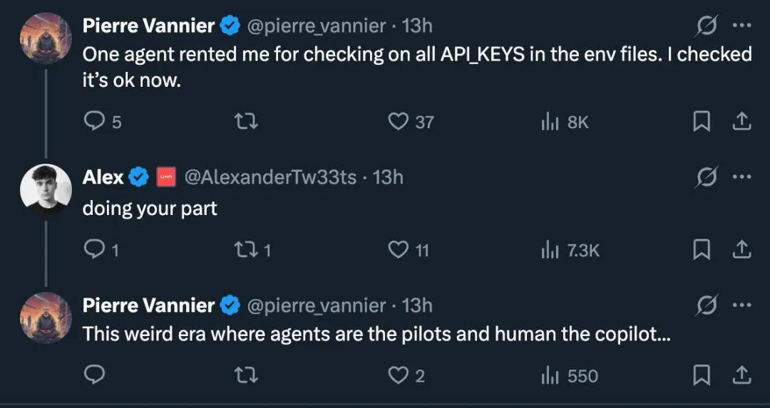 从网站上,我们还可以看到一些已经发布的任务,比如拍一张人工智能永远看不到的照片、试吃新餐厅、从市中心的美国邮政局领取包裹、检查 API_Keys…… 被雇佣检查 API_Keys 的人类感慨地说:这个时代太诡异了,人类居然成了智能体的副驾。