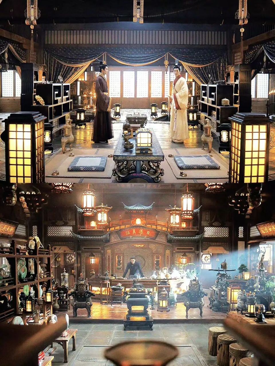 作为“时空中转站”的哑舍,它要有古香古色的神秘感。“所以它的灯光是偏昏暗的,有一条幽深的走廊。”但作为隐蔽时光电梯的古董店,“古董店的这样的一个质感是不能变,但后面设计了很多门、很多不同的走廊和错综复杂的结构,以展现这个空间的神秘。”设计上讲究乱中有序,“关于古董摆放和布置的方式,我们也去香港中环参考了一些真正的古董店。”