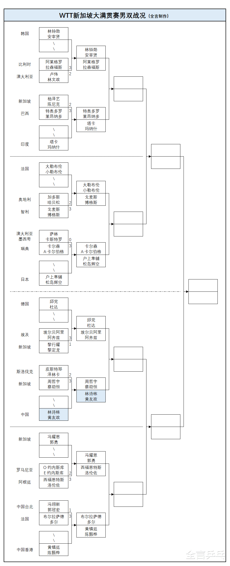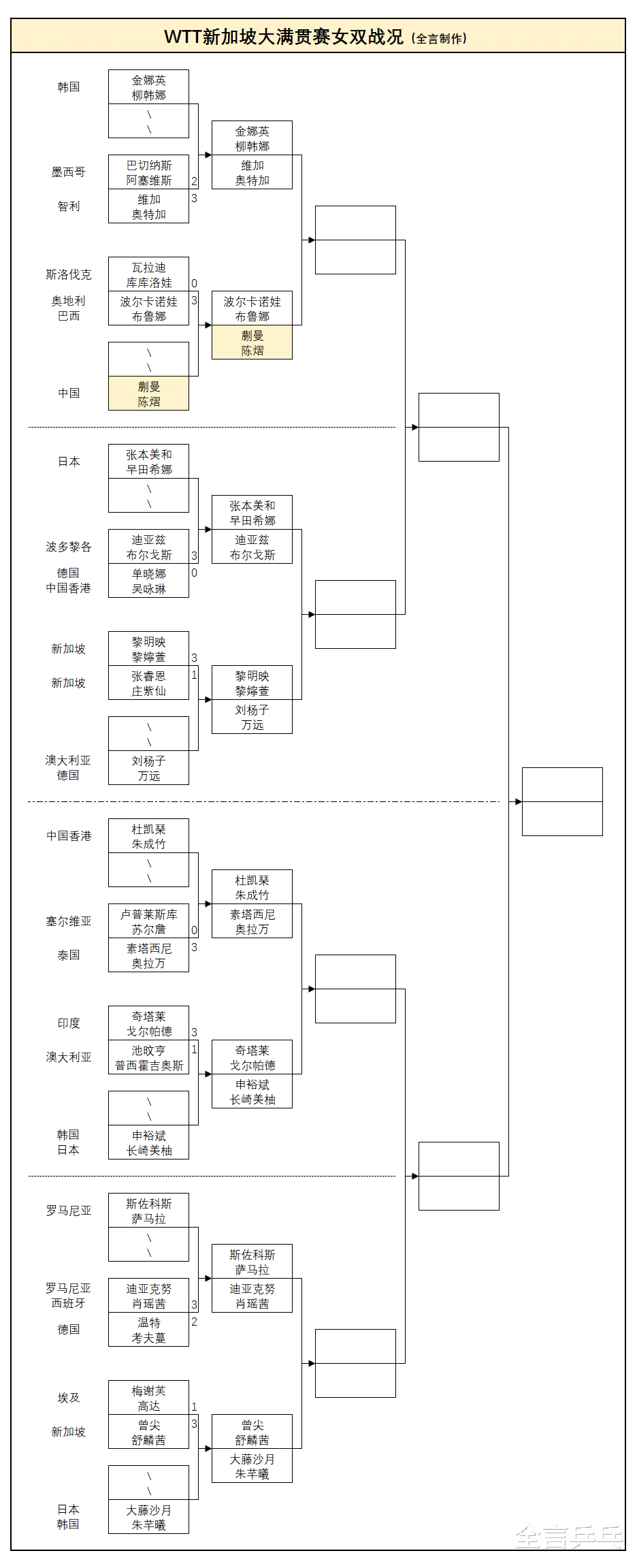 波尔卡诺娃/布鲁娜虽然是名将配对,但毕竟是跨国合作,默契度可能大打折扣,蒯曼/陈熠正常发挥的话应该能拿下;科顿有一定冲击力,周启豪不可小觑;普西霍吉奥斯和东道主球队的舒麟茜、周哲宇/蔡劭恒威胁不大,陈幸同、陈熠、林诗栋/黄友政晋级有保障。