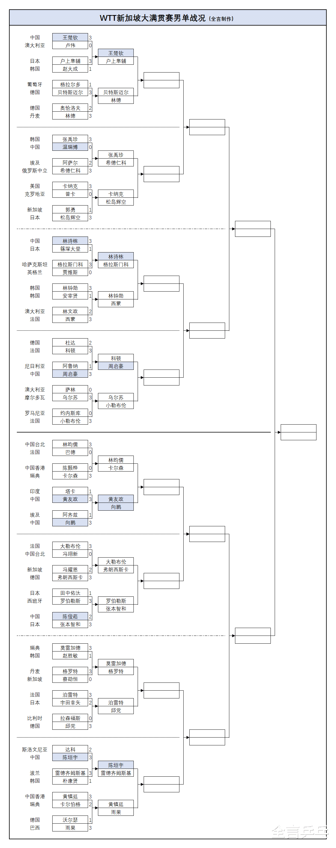 至于国乒另外6男8女则赢得了单打开门红的胜利,包括王楚钦、林诗栋、向鹏、周启豪、陈垣宇、黄友政以及孙颖莎、王曼昱、陈幸同、蒯曼、王艺迪、陈熠、石洵瑶、何卓佳,混双黄友政/陈熠也轻松过关,外协会松岛辉空/张本美和、林昀儒/郑怡静爆冷出局,各项详细战况如下: