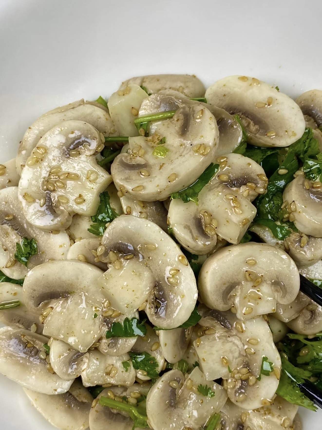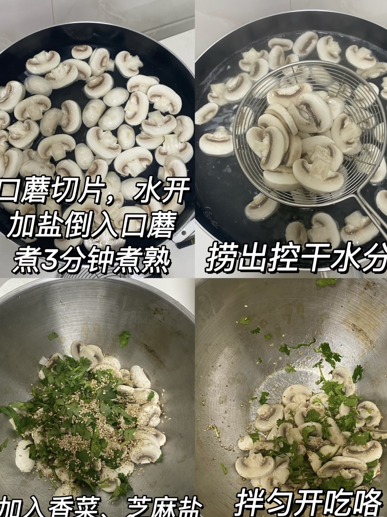 大碗里放口蘑片+芝麻盐+香菜段,用筷子轻轻翻拌,让每片“白玉小圆扇”都裹上“芝麻盐外衣”,香菜段像绿色小星星散落其间,最后再淋半勺香油,增香又提亮,像给整道菜开了“美颜滤镜”。