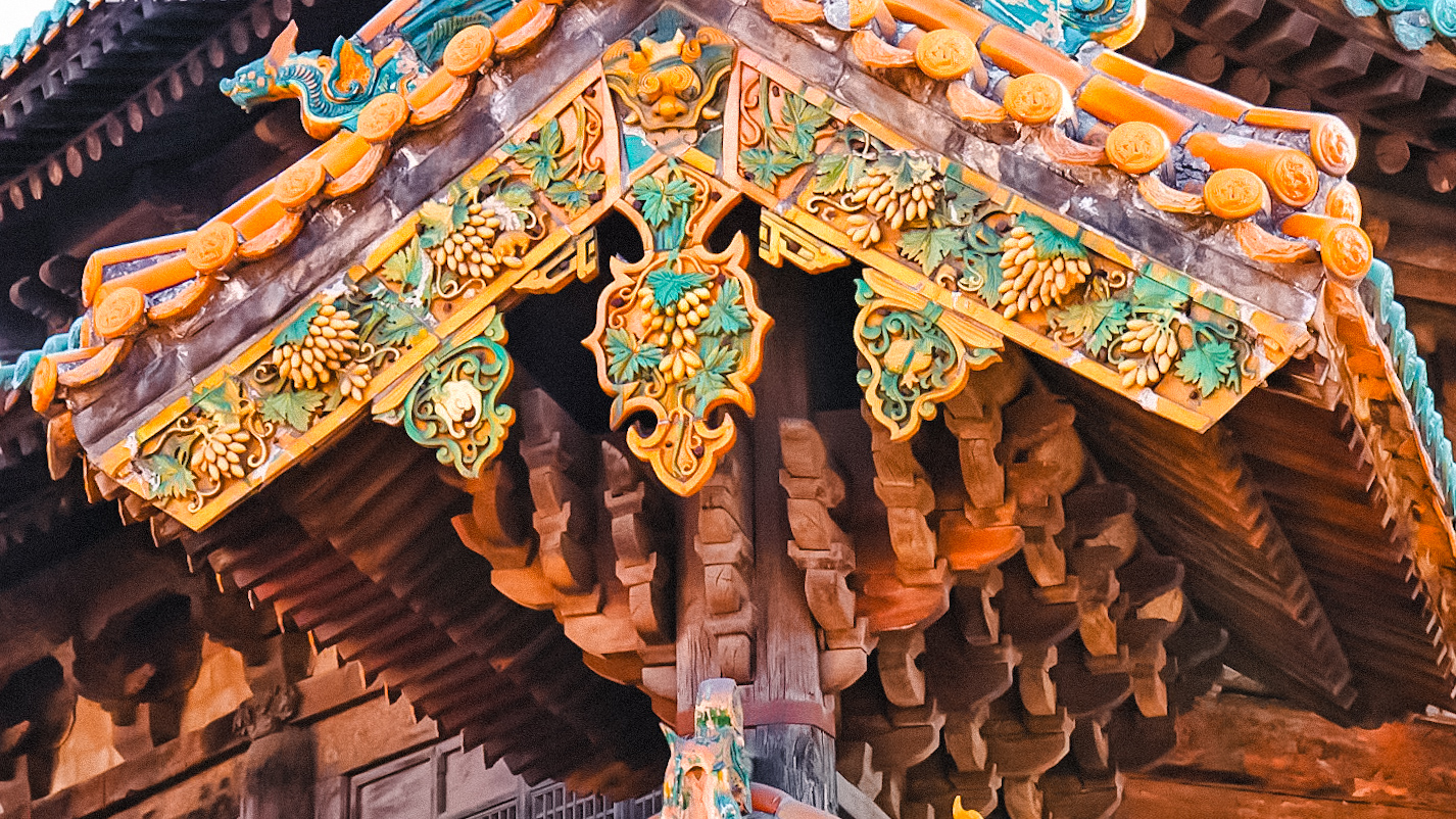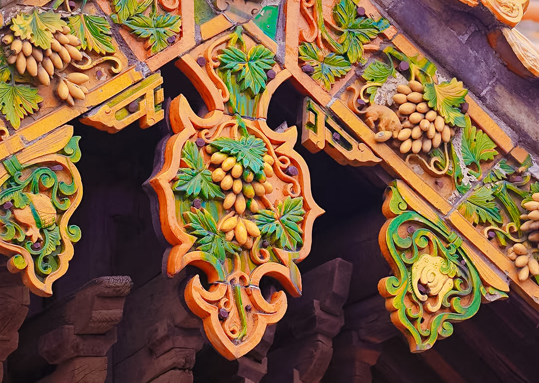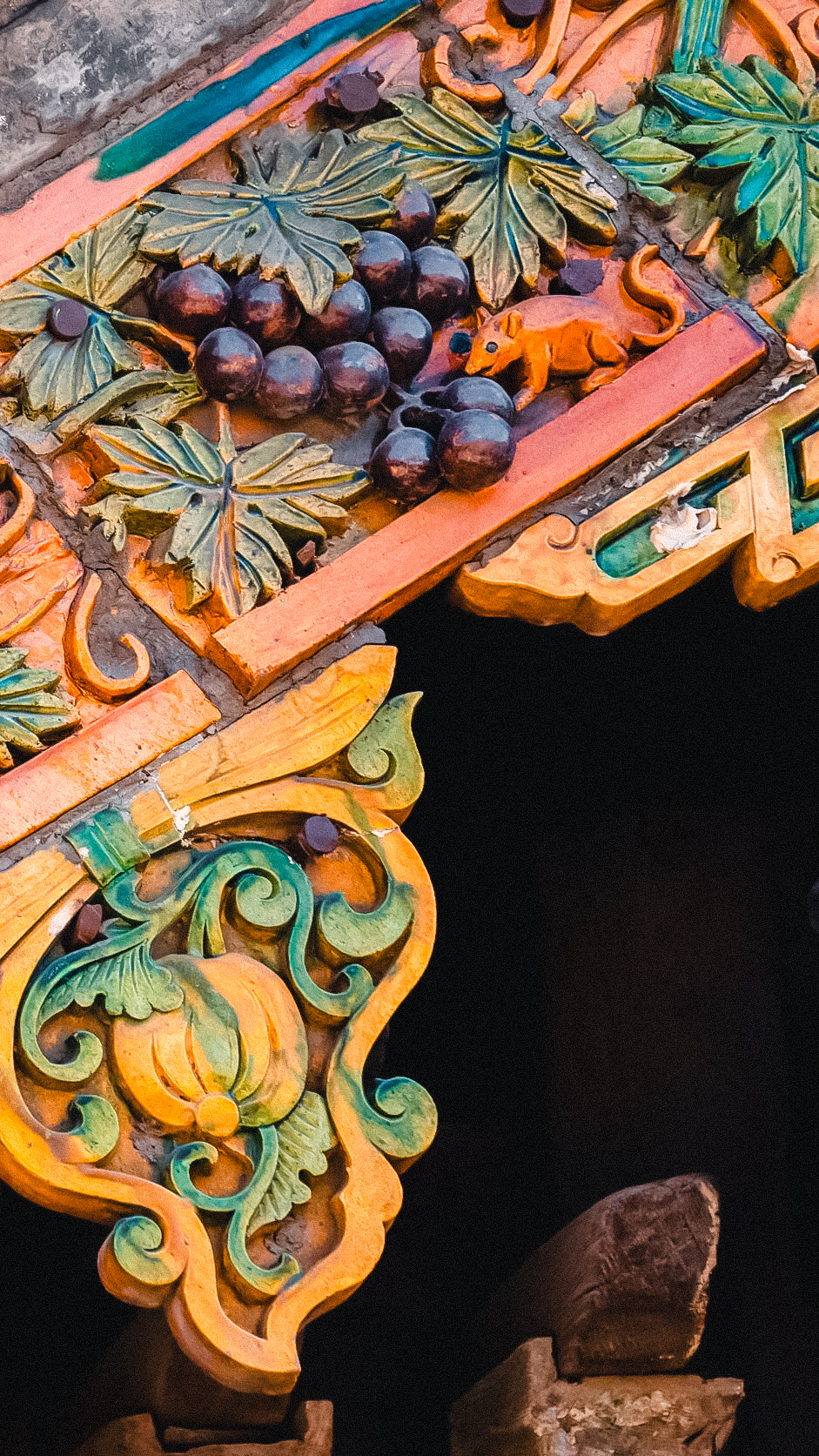谁也说不清当年的工匠是怀着怎样的心思,把这“偷食”的场景烧进琉璃里。要知道在明清的皇家建筑里,琉璃是礼制的化身,龙得盘踞在正脊,凤要歇在垂兽旁,连花鸟都得按着“富贵长春”“喜上眉梢”的规矩排布,哪有老鼠的容身之地?可介休的匠人偏不。他们守着汾河两岸的庄稼地,见惯了田埂上窜来窜去的老鼠——春播时偷咬谷种,秋收时啃食玉米,农户们举着扫帚追,嘴里骂着“遭瘟的东西”,可真到了荒年,看见老鼠饿得啃草根,又会叹口气把晒在院里的碎米留一把。这种又恨又怜的心思,被工匠揉进了陶土里,再裹上琉璃釉,烧出了这只不循常理的“偷葡鼠”。