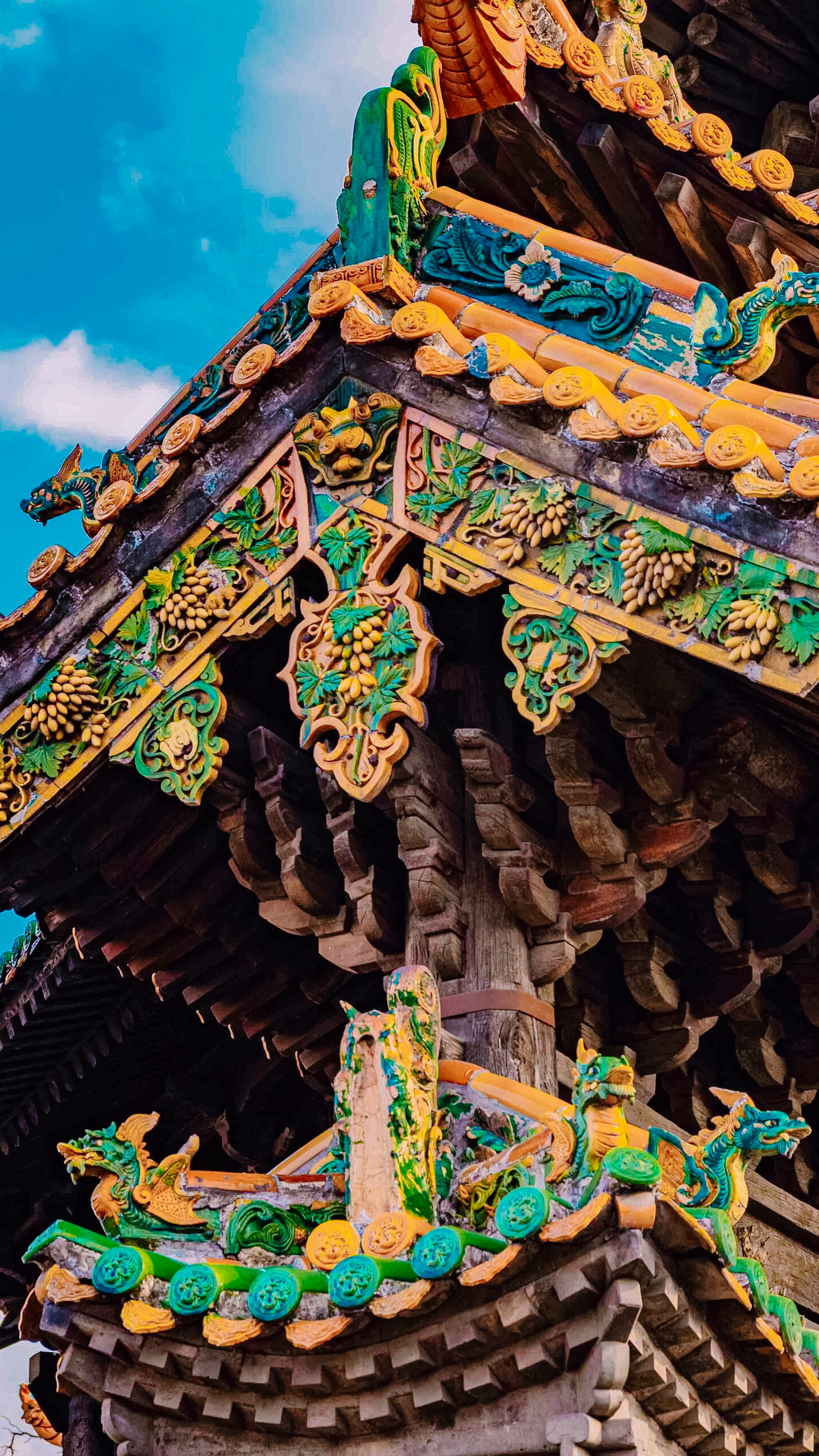 如今再去后土庙,总能看见有人围着照壁拍照。有人拍老鼠的俏皮模样,有人拍葡萄的精致釉色,还有人把手机举得高高的,想拍老鼠尾巴卷着的那个“问号”。偶尔有风吹过,戏台的木柱发出轻微的声响,像是在跟瓦当里的老鼠说话。这只跨越了五百年的琉璃鼠,见过明清时期的戏台繁华,听过民国年间的饥荒叹息,也看过如今游人如织的热闹景象。它不似龙凤那般端坐在神坛上,只在瓦缝间守着一挂葡萄,把庄稼人的生存哲学、匠人的巧思、普通人的悲欢,都藏进了那片流光溢彩的琉璃里。