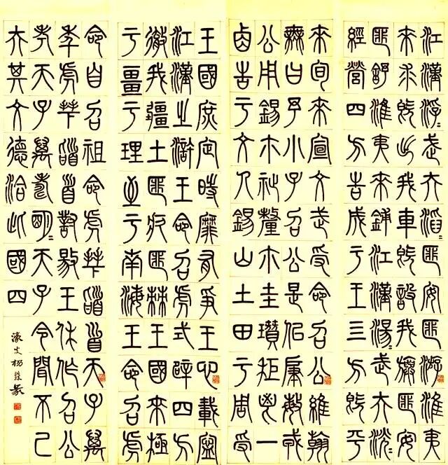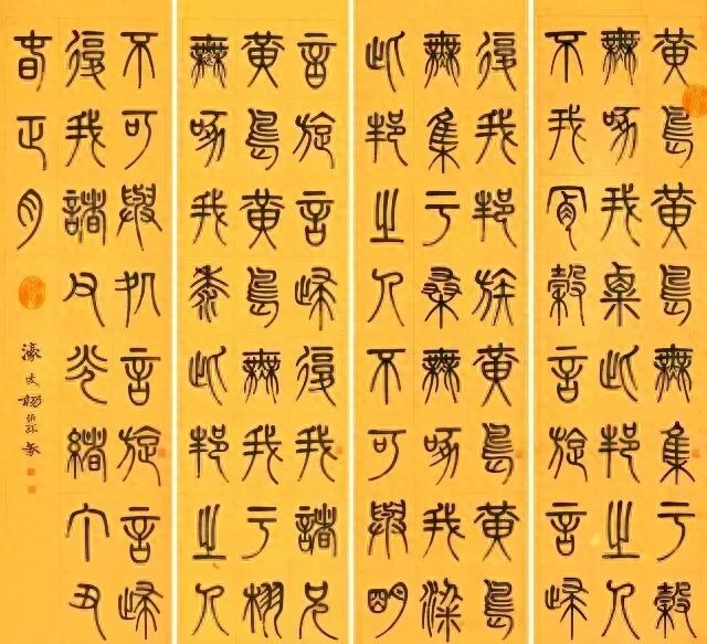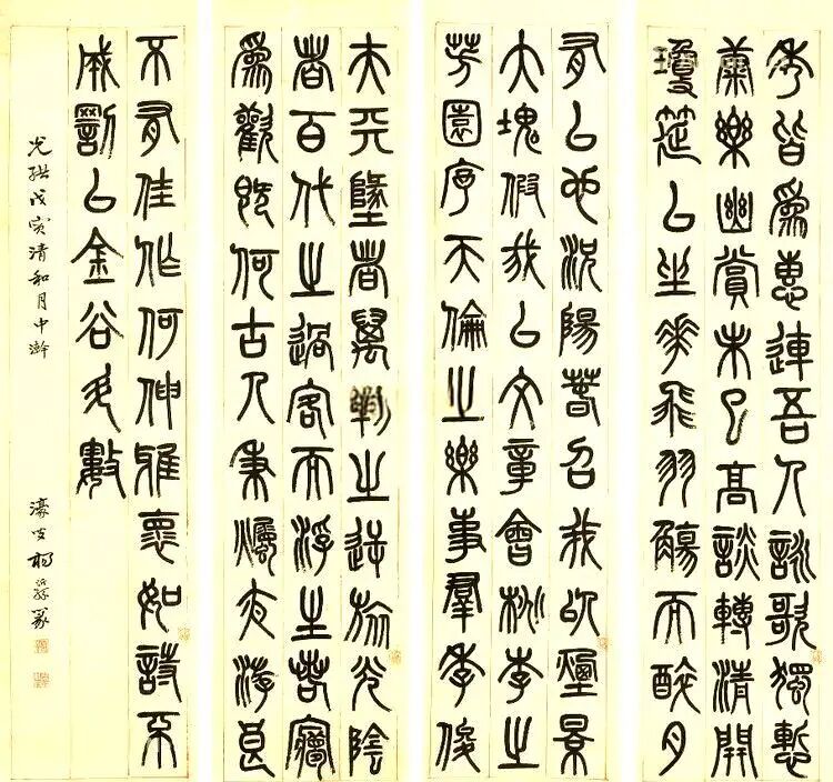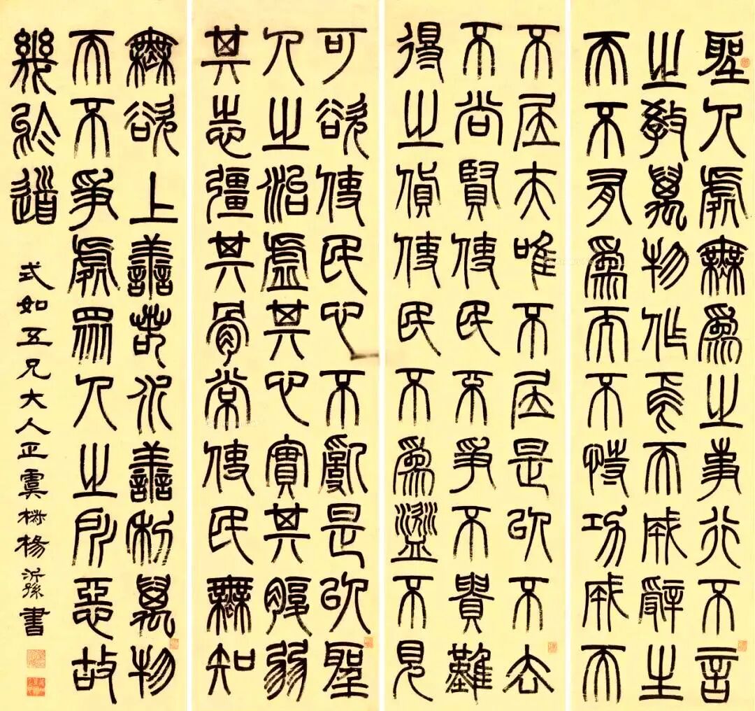 杨沂孙七条屏篆法渊懿,以金文之雄强融小篆之婉通,化长方为方整,笔力沉厚如铸,结字疏密得宜。款署“濠叟”更显金石考据之功,于晚清碑学浪潮中独标高格,观之如闻秦汉遗响,静穆中见飞动,为篆林不朽典范。