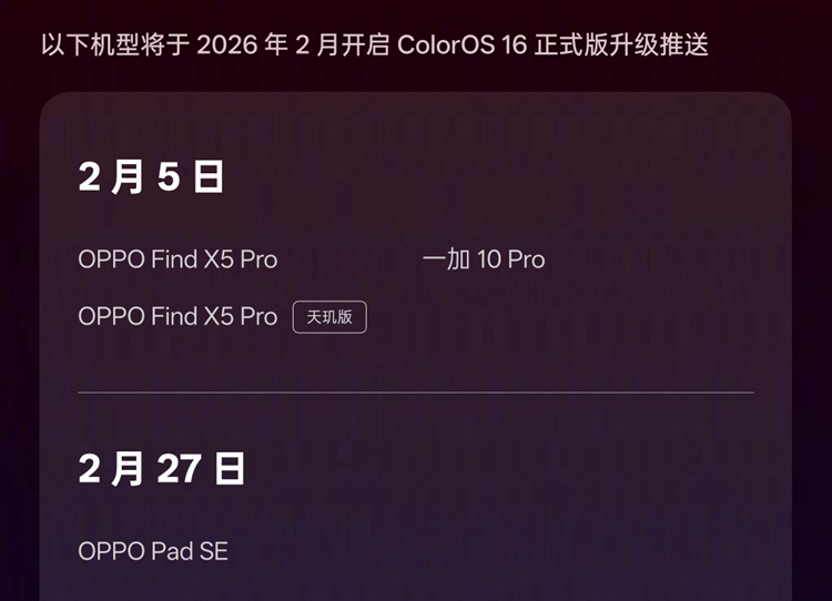根据OPPO发布的正式版升级计划,2月5日,OPPO Find X5 Pro、OPPO Find X5 Pro天玑版以及一加10 Pro将会正式推送ColorOS 16正式版。2月27日,OPPO Pad SE将会开启推送。