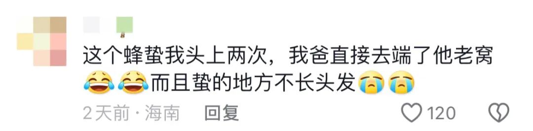 “这个蜂蛰我头上两次,我爸直接去端了它老窝,而是蛰的地方还不长头发。”