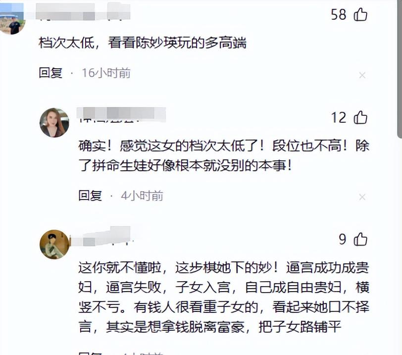 然而,网友们对钟睿心的行为却有着不同的看法。有些人认为她的策略高明,即使逼宫失败,子女也能获得豪门的资源,自己则成为自由贵妇。而另一些人则认为她的段位不高,除了拼命生娃似乎没有其他本事。这样的争议让人不禁想起另一位豪门女性——陈妙瑛。相比之下,陈妙瑛没有孩子,而是专注于帮助李惠莉打理公司,确保财产归原配小孩。这样的对比让人不禁感叹,豪门的世界果然是一个充满策略和博弈的战场。