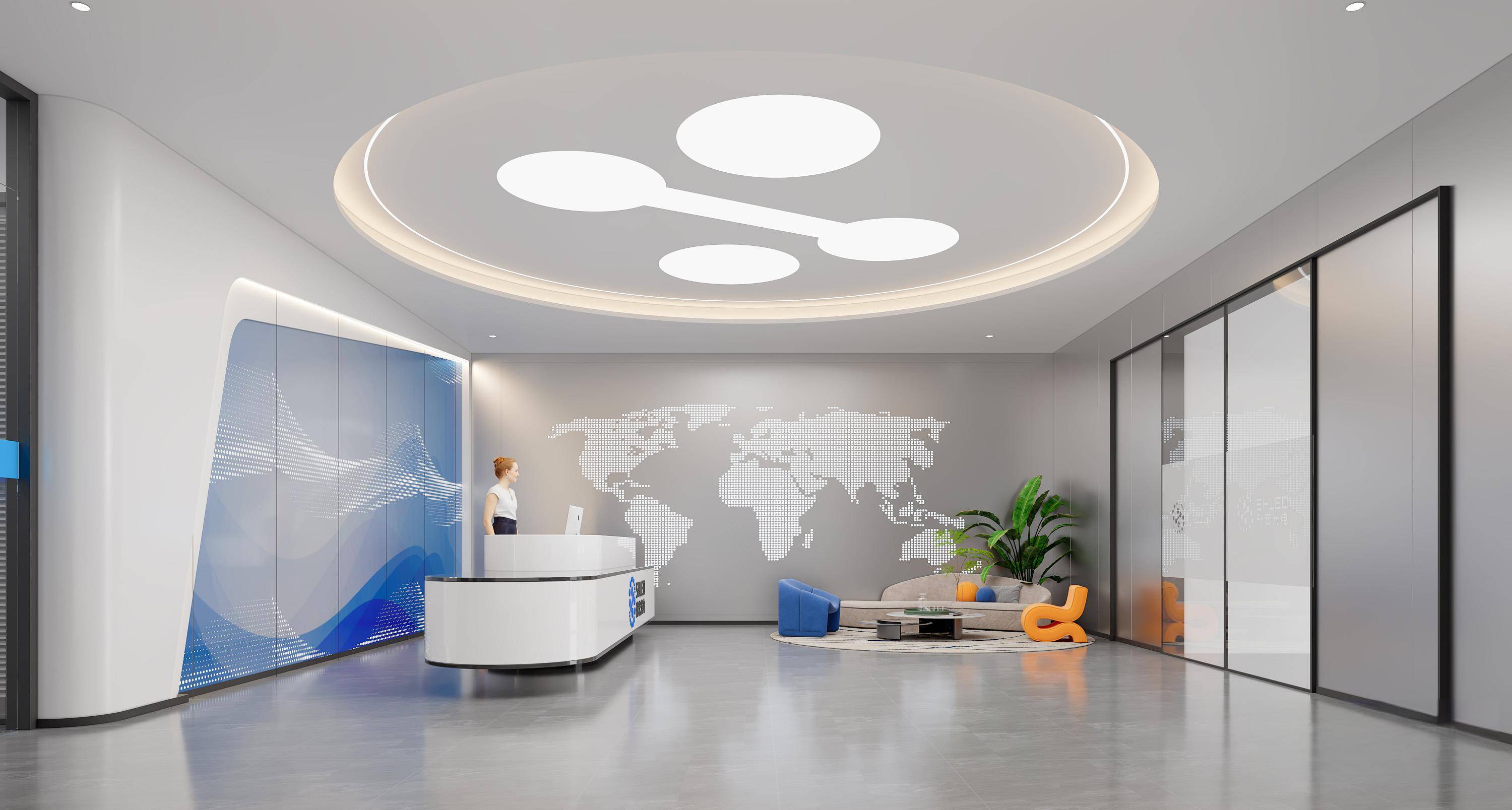 设计理念:用极简白、浅木色与智能灯光打造科技感空间,开放式工位 + 绿植区兼顾协作与舒适,展示区、荣誉墙强化品牌属性,会