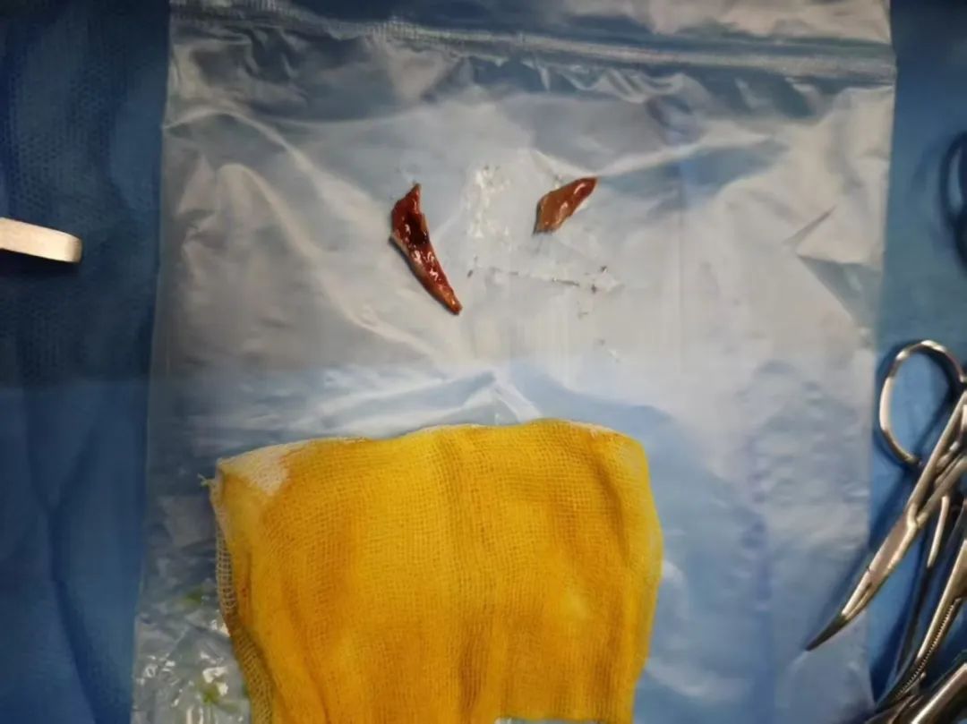 幸好,在郭主任行云流水的操作下,食管镜再次深入探查,骨头未滑动多远,在往里六公分处被“揪”出来了,郭主任用七十公分左右长的一把钳子伸入轻松夹取出一小块骨头,但明显和C T片上的不符,但是再往前又未见异物,遂后退食管镜,继续寻找,结果在食管距门齿十九公分处发现肿胀糜烂出血,在距门齿二十公分看见一尖锐带鲜血的大骨片,顺利钳出。经仔细探查确认无异物后才退出食管镜。