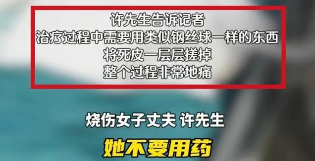 许先生告诉记者,她每时每刻都在痛,因为在治疗的过程中,需要用类似钢丝球一样的东西将死皮一层层给搓掉,整个过程非常痛。