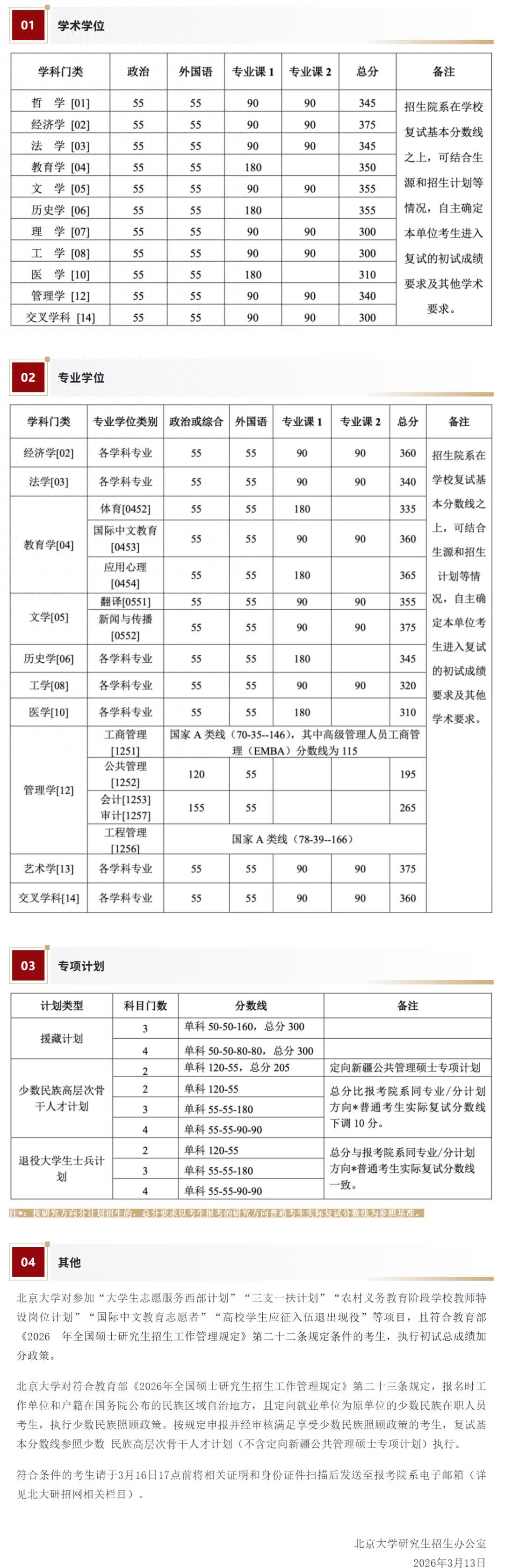 2.“退役大学生士兵计划”复试分数线为:在学校划定的复试基本分数线基础上,报考全日制的(考试科目满分为500分)单科降5分,总分降10分;报考非全日制的(考试科目满分为300分)单科降10分,总分降10分。