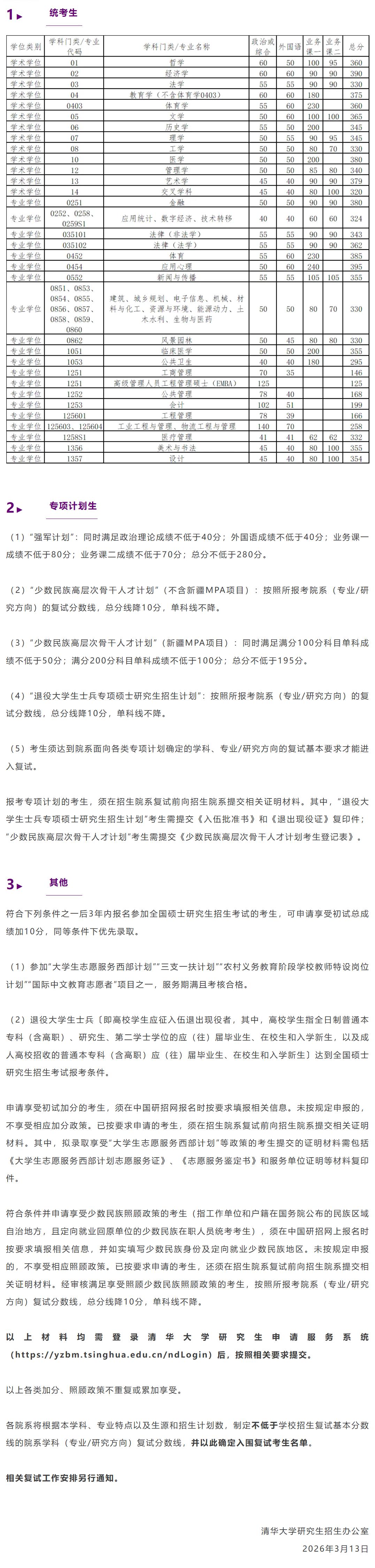 3.参加“大学生志愿服务西部计划”“三支一扶计划”“农村义务教育阶段学校教师特设岗位计划”“国际中文教育志愿者”“高校学生应征入伍服义务兵役退役”等项目服务期满并考核合格的考生,按照教育部当年度相关规定享受加分政策。以上加分项目不累计。工作单位和户籍在国务院公布的民族区域自治地方,且定向就业单位为原单位的少数民族在职人员考生,在学校划定的复试基本分数线基础上总分降10分。照顾政策按照有关部门审核结果执行。报考专项计划的考生,不再享受初试加分和少数民族照顾政策。