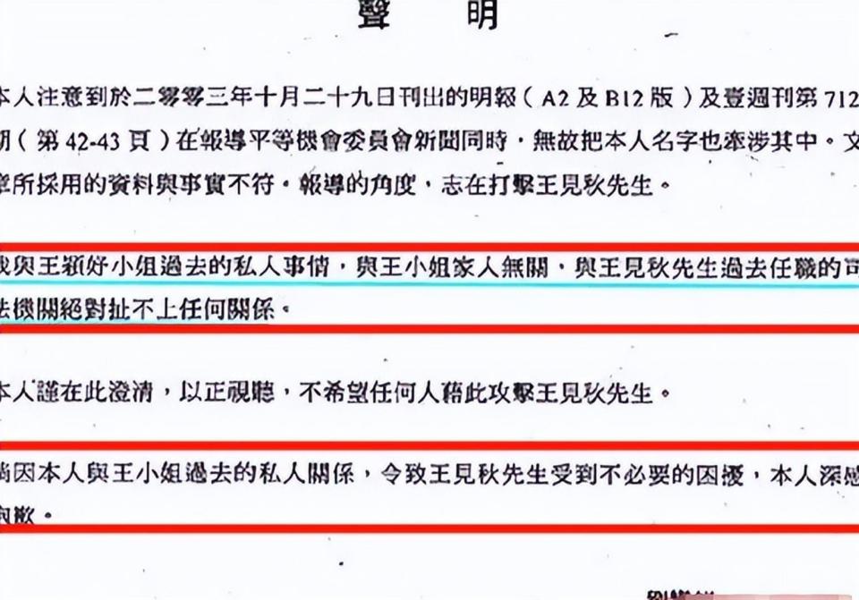 转折发生在2003年。 王颖妤的父亲,退休法官王见秋卷入“双薪”争议,被指在领取退休金的同时担任公职获取收入。 有舆论将矛头指向王颖妤,暗示其父的花销来源于女儿从富豪处获得的财富。 这场风波危及整个家庭的名誉。