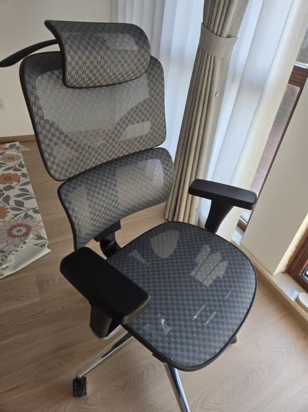 这把椅子给人的第一感觉就是“扎实”。16kg合金骨架和铝合金脚架让整体重量偏大,稳定性很好,但缺点也很明显——移动时比较费力,尤其是在地毯或不太顺滑的地面上。网布透气性不错,夏天坐久了不闷,但触感偏中性,不是那种很软的类型。整体更适合固定工位使用,不太适合经常需要挪动椅子的位置。