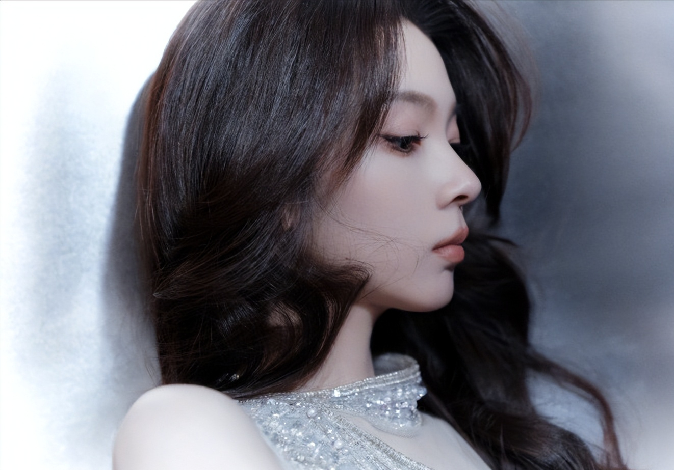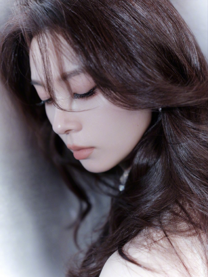 在这张特写中,陈瑶微微侧脸,长发如丝缎般顺滑地垂落,睫毛轻颤,眼眸低垂,流露出一丝恬静的美感。背景的冷色调与她的肤色形成鲜明对比,更凸显出她的五官精致如雕刻般无可挑剔。这一刻,她仿佛沉浸在一场关于光影的梦境之中,静谧而深邃。