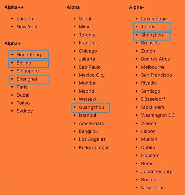 Alpha+(世界一线强城市): 香港、北京、上海
