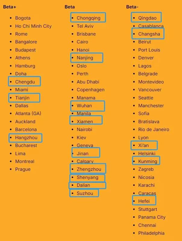 Beta(世界二线城市): 重庆、南京、武汉、厦门、济南、郑州、沈阳、大连、苏州