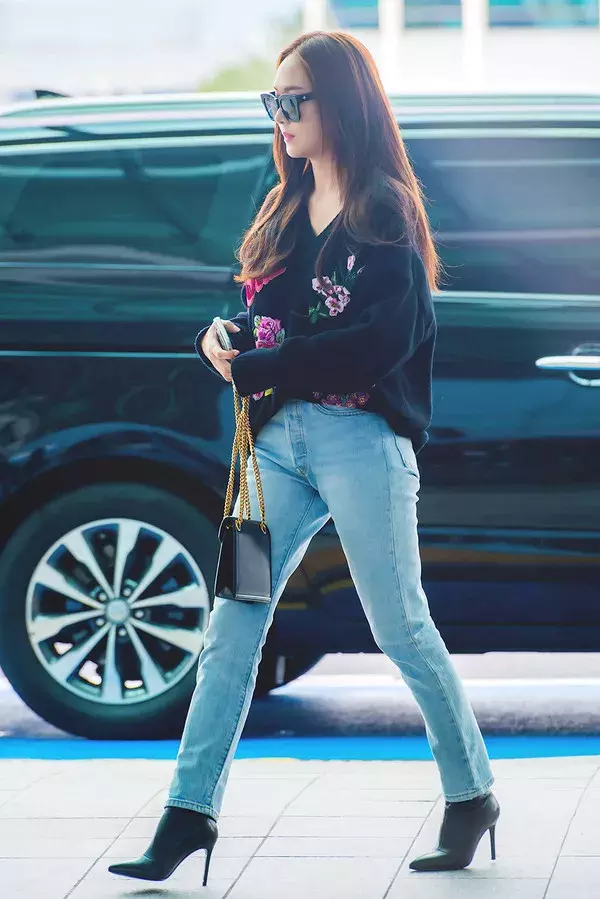 郑秀妍身穿杜嘉班纳 (Dolce&Gabbana) 黑色刺绣毛衣,V领的设计拉长颈部曲线,同时也衬得脸部精致而小巧,下身搭配纯色牛仔裤,将毛衣的一角随意的塞进来,增添了些许慵懒感,脚踩一双黑色皮靴,整体干练率性却不失温柔。