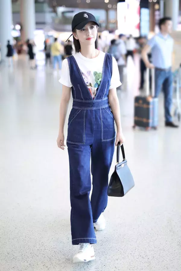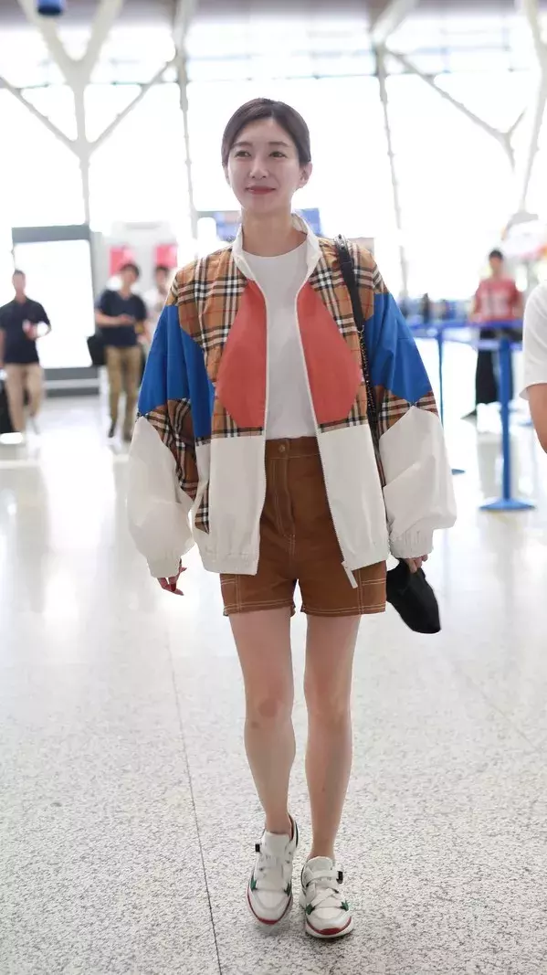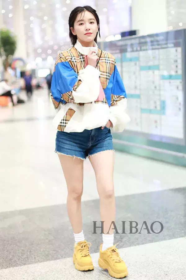 像孙怡这样上长下短的时髦穿法,星星们的机场街拍中也很常见。阚清子就身着博柏利 (Burberry) 格纹拼接外套+牛仔短裤现身,不过阚清子虽然用黄色户外靴与格纹上衣来做呼应,但她搭配的这条牛仔短裤颜色以及款式都有些偏旧,感觉有点突兀。