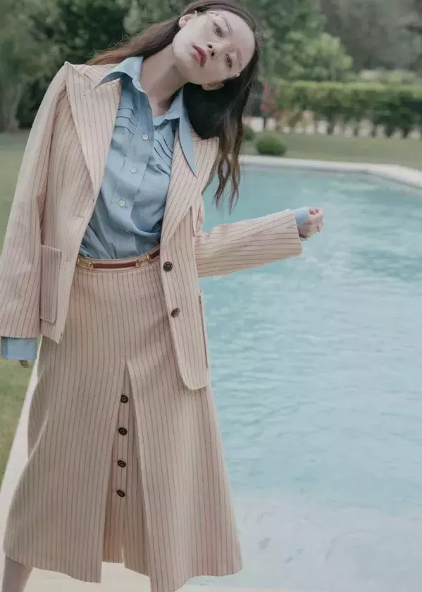 倪妮选择了套装的穿法,这套古驰 (Gucci)条纹套装粉嫩嫩的颜色格外显温柔,西装与半裙上的圆形扣子相互呼应,带了几分法式的浪漫与复古味道,倪妮随便摆上几个Pose,时髦与高级感就呼之欲出。