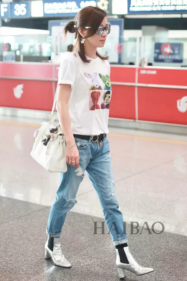 这件百搭基础的印花Tee佘诗曼也有同款,搭配破洞牛仔裤与银色高跟裸靴是很常规不出错的时髦穿法。背包上的小熊挂件与上衣的小熊相呼应,难道“娘娘”也有颗少女心?