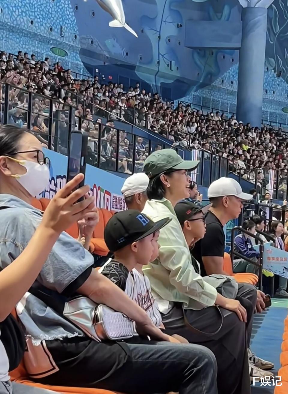 最近胡杏儿就到内地宣传新开播的新剧,原来老公李乘德都有带着儿子们来内地。随后有网友拍到他们一家人在主题乐园看表演,据悉他们是看水生动物表演,而从画面看到戴着绿帽子、穿浅绿色上衣的胡杏儿看得很兴奋,而旁边的儿子同样看得很开心。