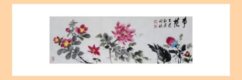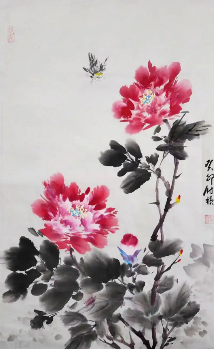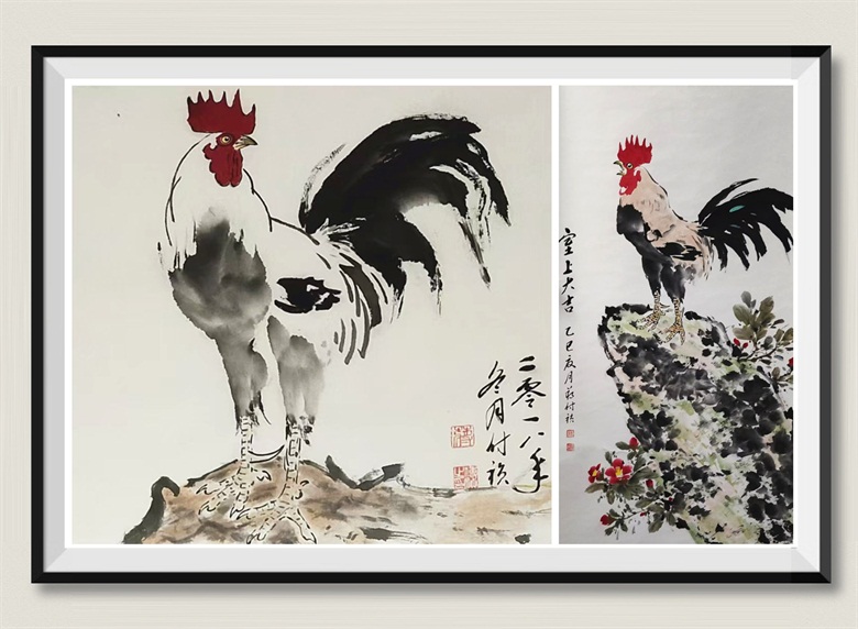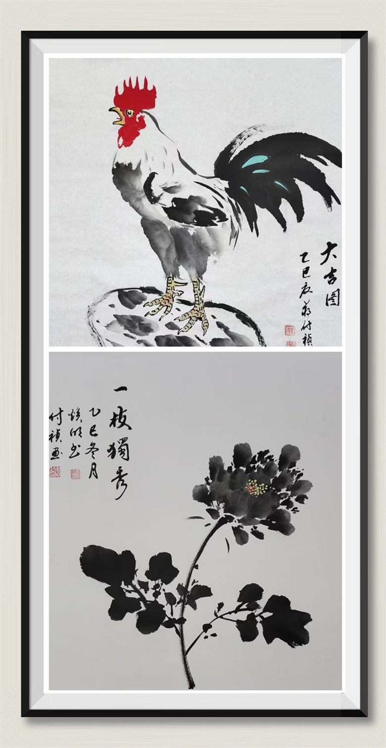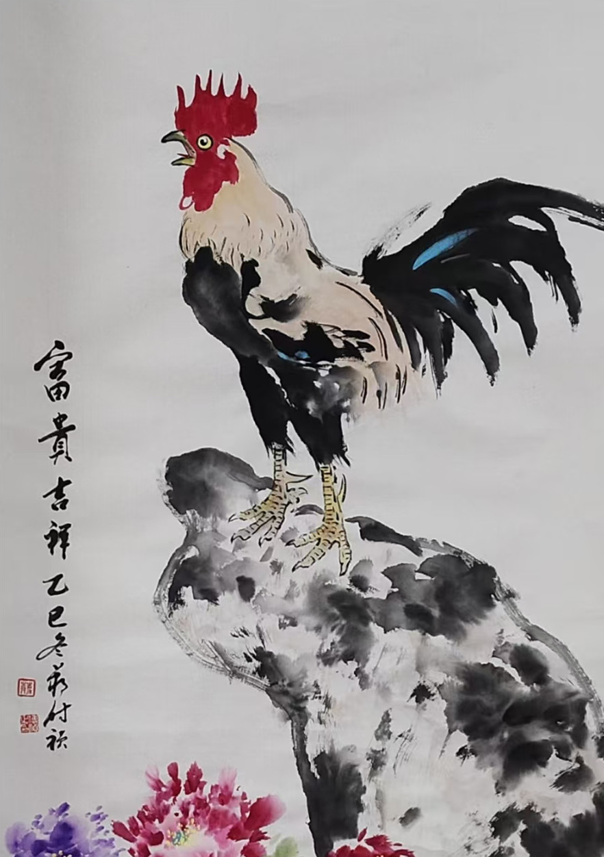 蒋付祯的作品以花鸟画见长,擅长通过自然题材传递个人情志和艺术追求。比如《雄鸡图》《牡丹花》等作品,既展现了传统花鸟画的韵味,又融入了现代审美,显得生动而富有感染力。他长期跟随多位教授学习,形成了多元的技法体系。作品既保留了传统笔墨的韵味,又融入了现代元素,风格清新又不失传统底蕴。