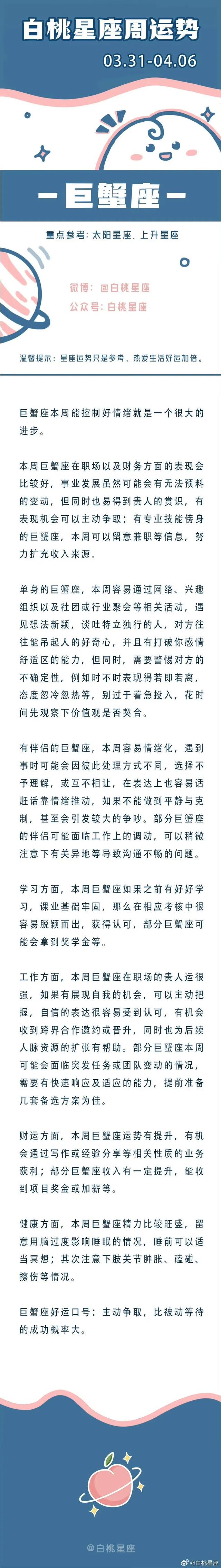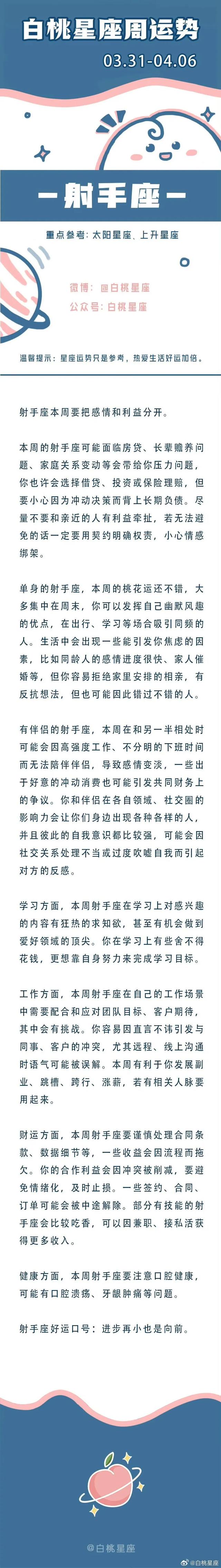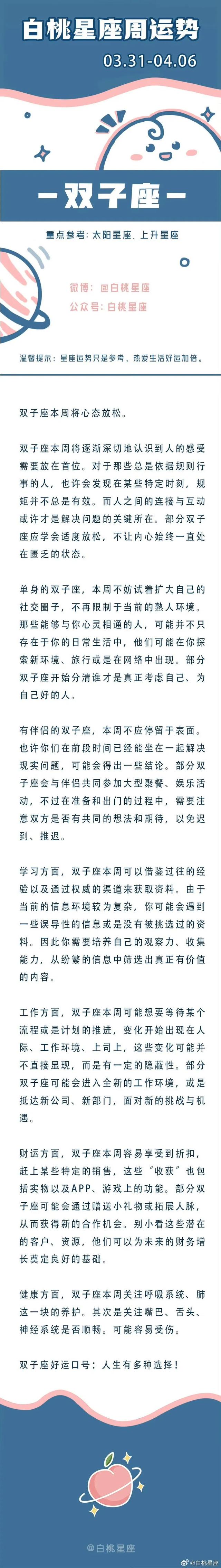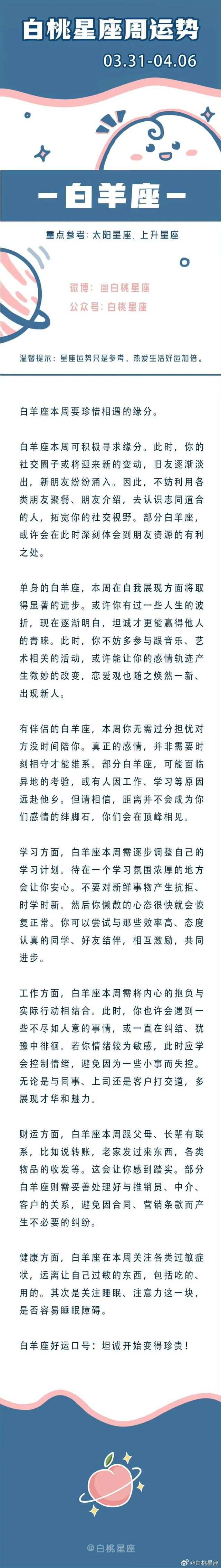 十二星座一周运势白桃星运(03.31-04.06 星座运势)各位宝子们,有什么需要更新的可以给我提个意见哈[送心]
