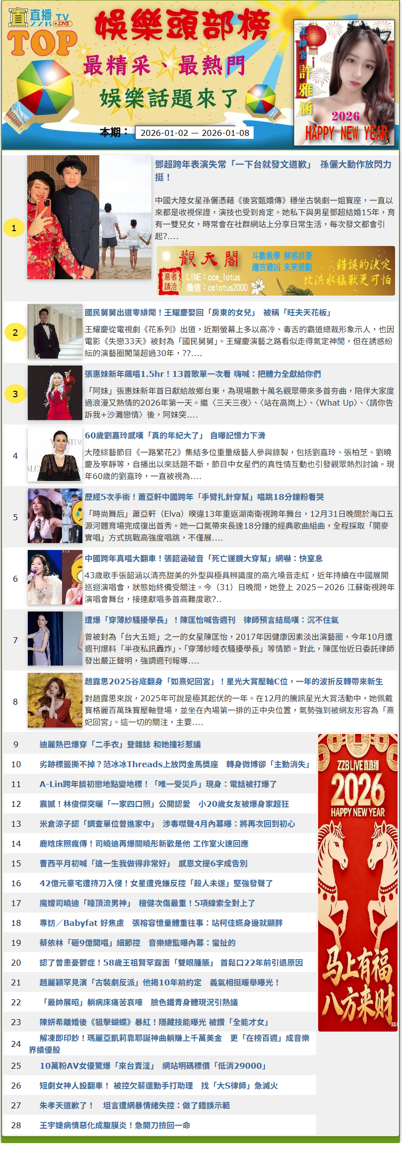 許雅涵直直播娛樂頭部榜:本期2026-01-08 每週最精采、最勁爆、最熱門娛樂話題來了。