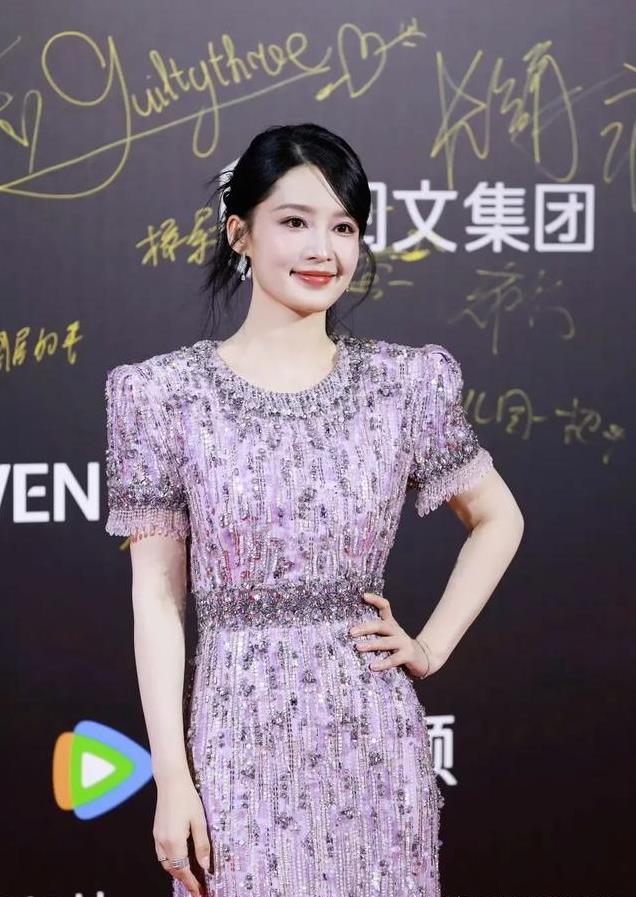 身穿紫色珠串闪片裙的她,今晚好温柔!