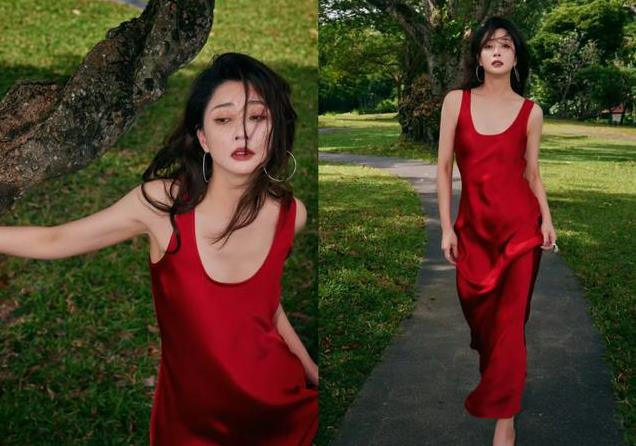 这条设计简约的红色绸缎裙,搭配她的微卷发,特别有港风美人的味道!