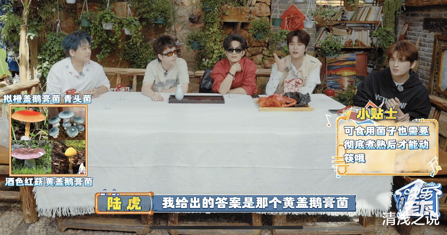 到了《有毒菌子猜猜猜》第一题,陆虎又猜对了。节目组给出四个云南菌子图片——拟橙盖鹅膏菌、青头菌、酒色红菇、黄盖鹅膏菌,让老北北从四个图片中选出那个有毒的图片。陆虎可能是六人里到云南呆的时间最长的一位,到底他婚礼是在丽江办的,尽管他说云南本地人都经常中(菌子的)毒,但他这个外地人还是给出了正确的答案——黄盖鹅膏菌。