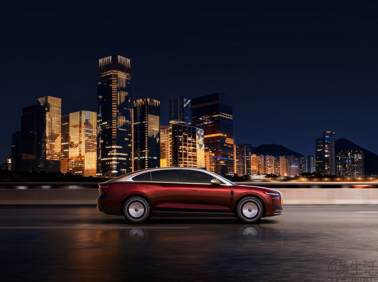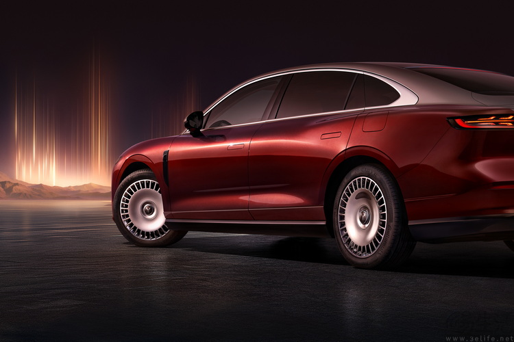 车身侧面,追光L一方面具备平直的雪茄型车身线条,通过厚重的车身主体搭配小面积的车窗设计,营造出百万级豪车常见的低重心视觉印象。同时巨大的20英寸“光晖”轮毂不仅尺寸大,更有着豪车标志性的悬浮车标设计。
