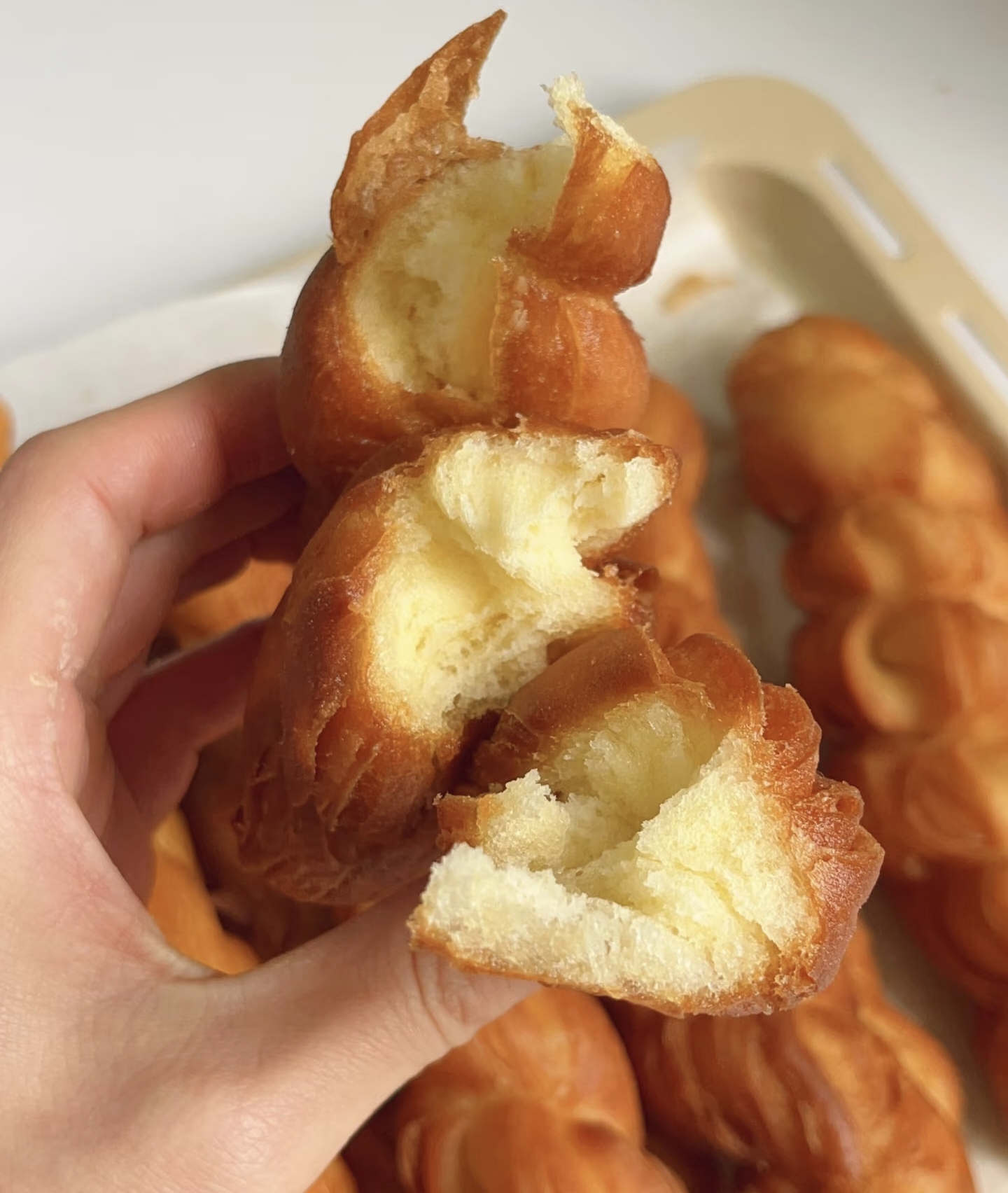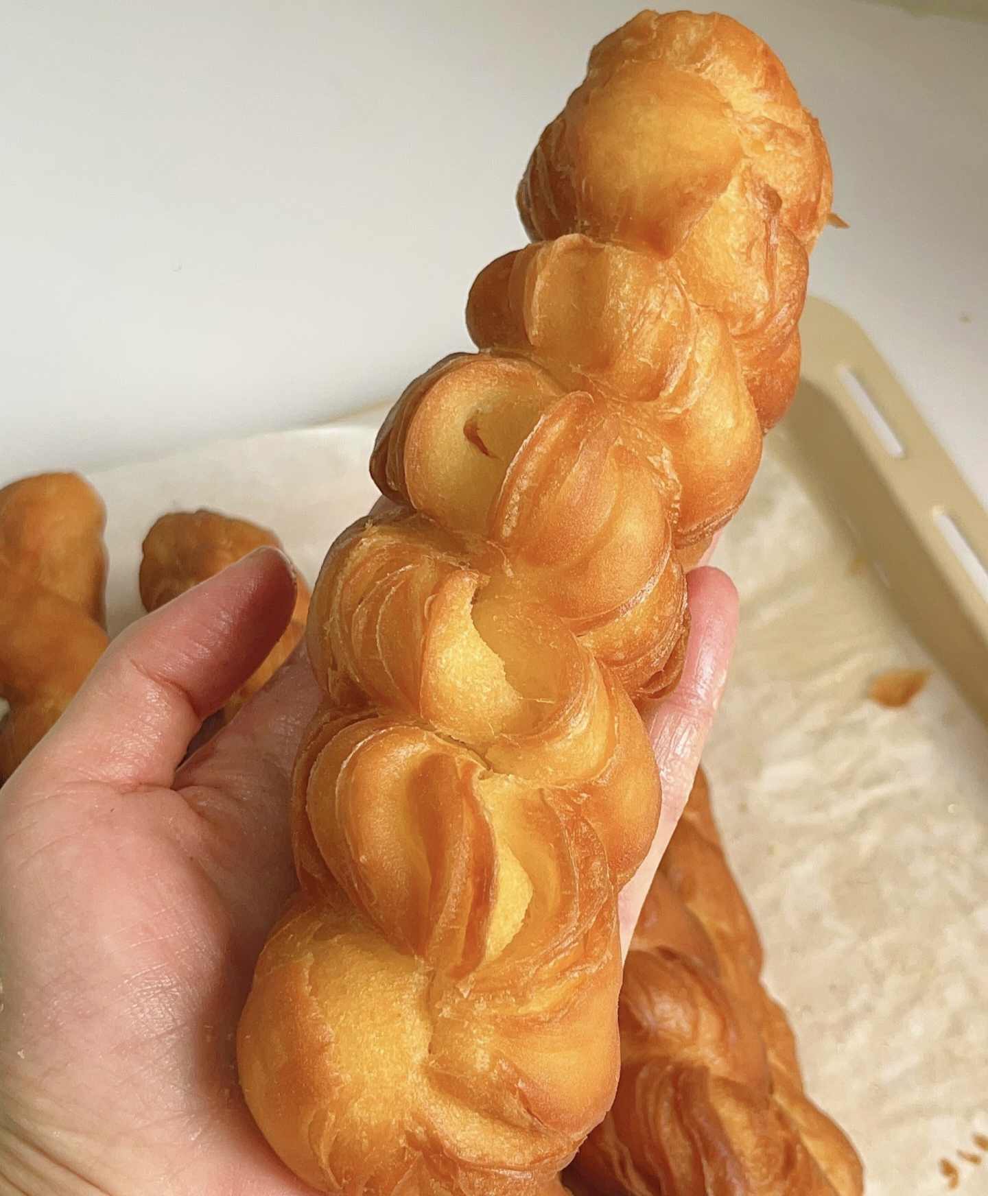 发酵好的面团就像一个充满气的气球,变得胖乎乎的。把面团取出来放在案板上,撒上一些干面粉,防止面团粘连。然后给面团揉揉,排排气,就像给气球放放气一样。接着把面团搓成长条,再分成大小均匀的小剂子,每个小剂子大概像乒乓球那么大。取一个小剂子,搓成细长条,这一步就像在搓橡皮泥一样有趣。把搓好的长条对折,然后一手捏住一端,另一手像拧毛巾一样把面条拧几圈,再把两端捏在一起,一个漂亮的麻花坯就做好啦!按照这个方法,把所有的小剂子都变成麻花坯。