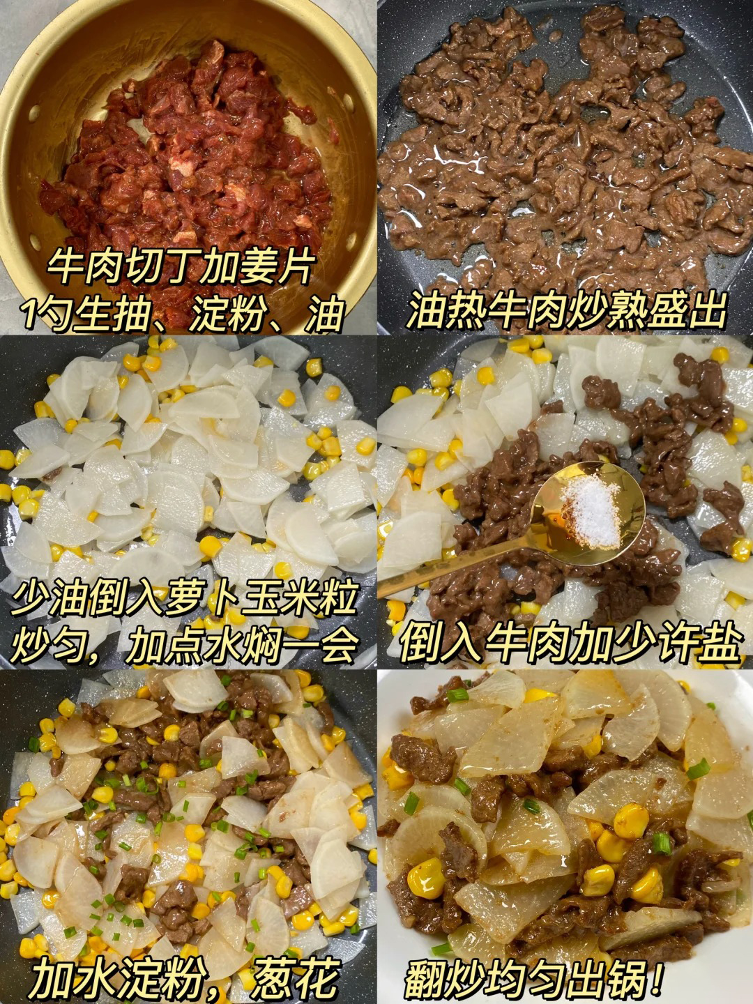 3、锅中留底油,下萝卜片炒软,再加入玉米粒和牛肉,调入少许盐与蚝油,翻炒均匀即可出锅。