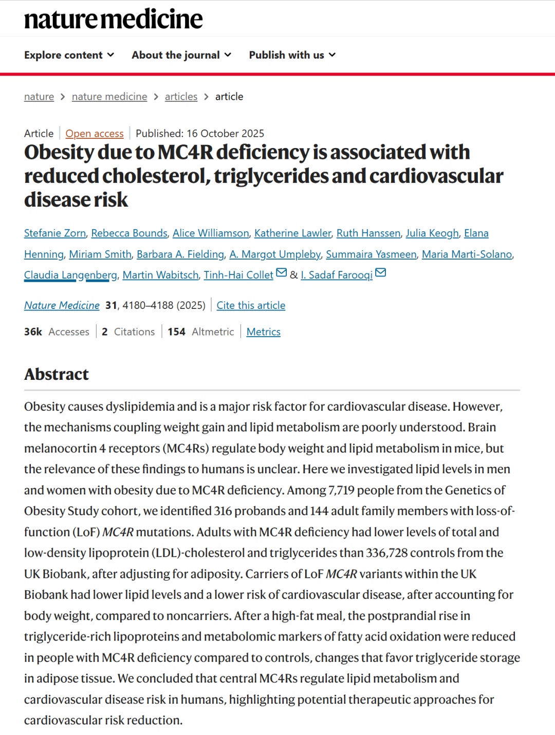 标题:Obesity due to MC4R deficiency is associated with reduced cholesterol, triglycerides and cardiovascular disease risk