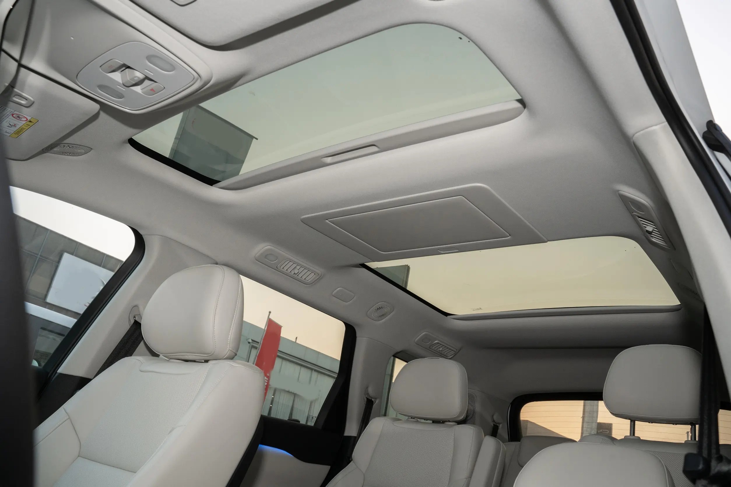 整车长宽高分别为4915*1905*1770mm,轴距为2825mm,中大型SUV的身材不仅看着有气场,同时带来了充足的车内空间,车内采用了2+2+2的6座布局,身高1.77米的体验者在前排调整好坐姿,再进入到第二排,腿部空间有2拳距离,头顶空间有1拳多的余量,从中间通道进入到第三排比较方便,而第三排腿部空间有1拳的距离,头顶空间有1拳左右的余量,不会造成拥挤和压抑感,第一排和第二排座椅都是电动调节的,座椅填充厚实柔软,对身体和大腿部位承托性好,具有座椅加热和通风功能,并且第二排座椅前后可调、靠背可调节,配有小桌板,可选装后排多媒体屏幕,此外头顶的全景天幕采用面积大,车内通透度良好,还可选装分段式天窗。