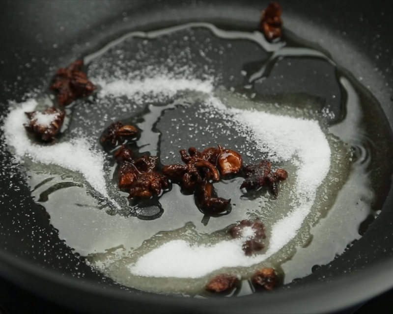 3. 锅烧热后倒入少许食用油,放入八角煸香,放入白砂糖,小火慢慢熬炒,煸炒至棕色。注意火候,不要炒糊了。