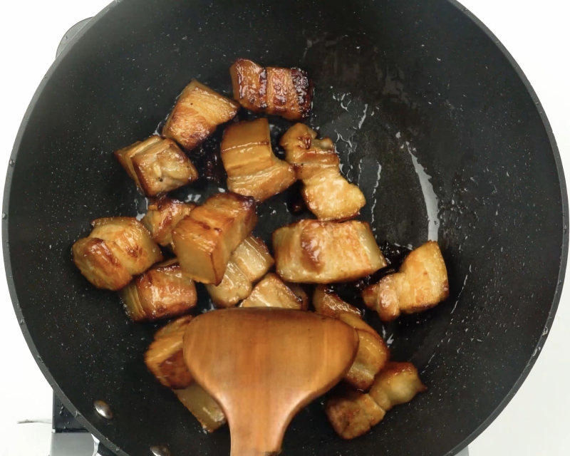 5. 倒入黄酒、酱油,翻炒至酱油均匀地吸附在肉上。