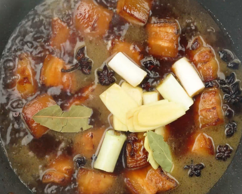 6. 注入开水,与肉持平,放入葱段、姜片、香叶、冰糖。