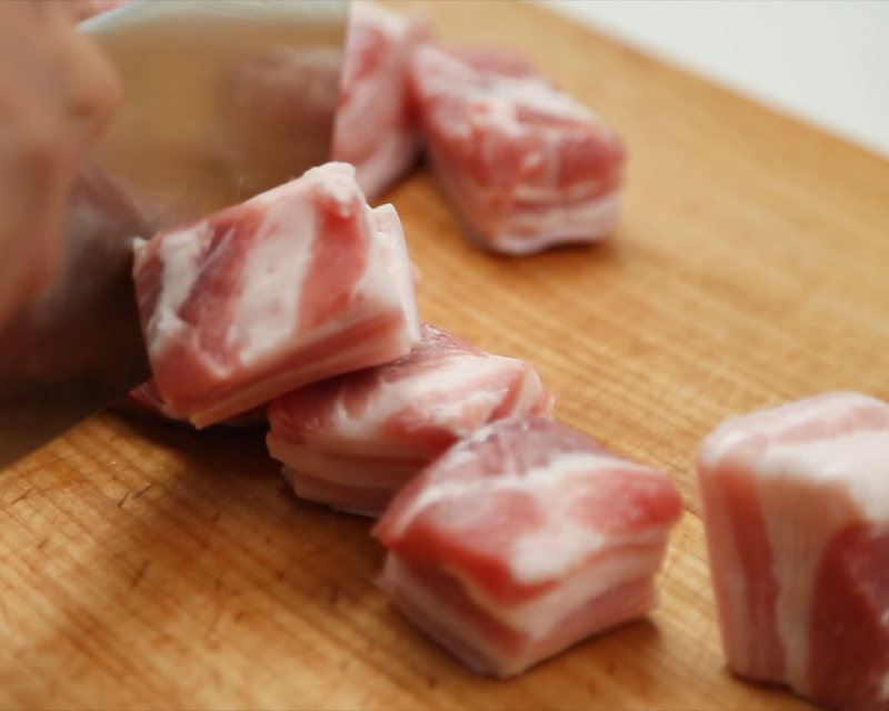 1. 将五花肉清洗干净,切成大小均匀的块状。
